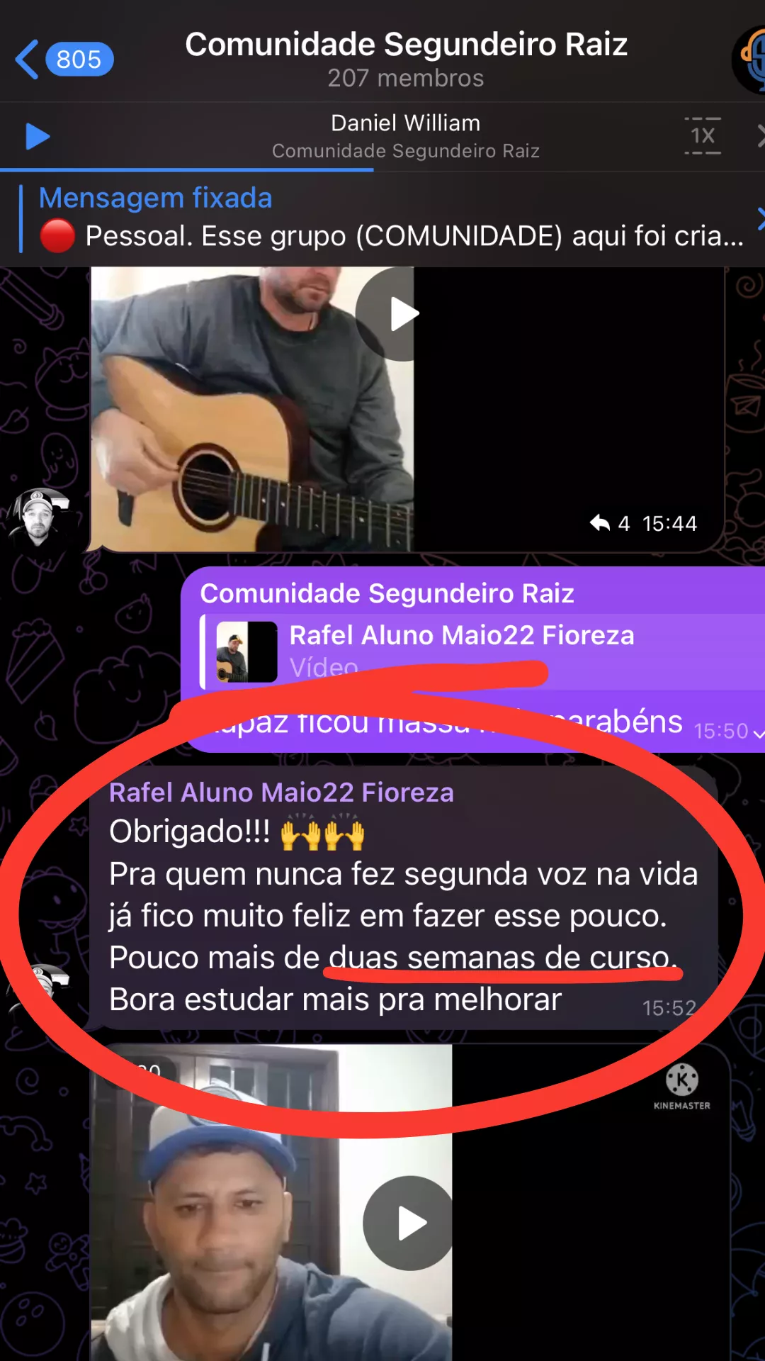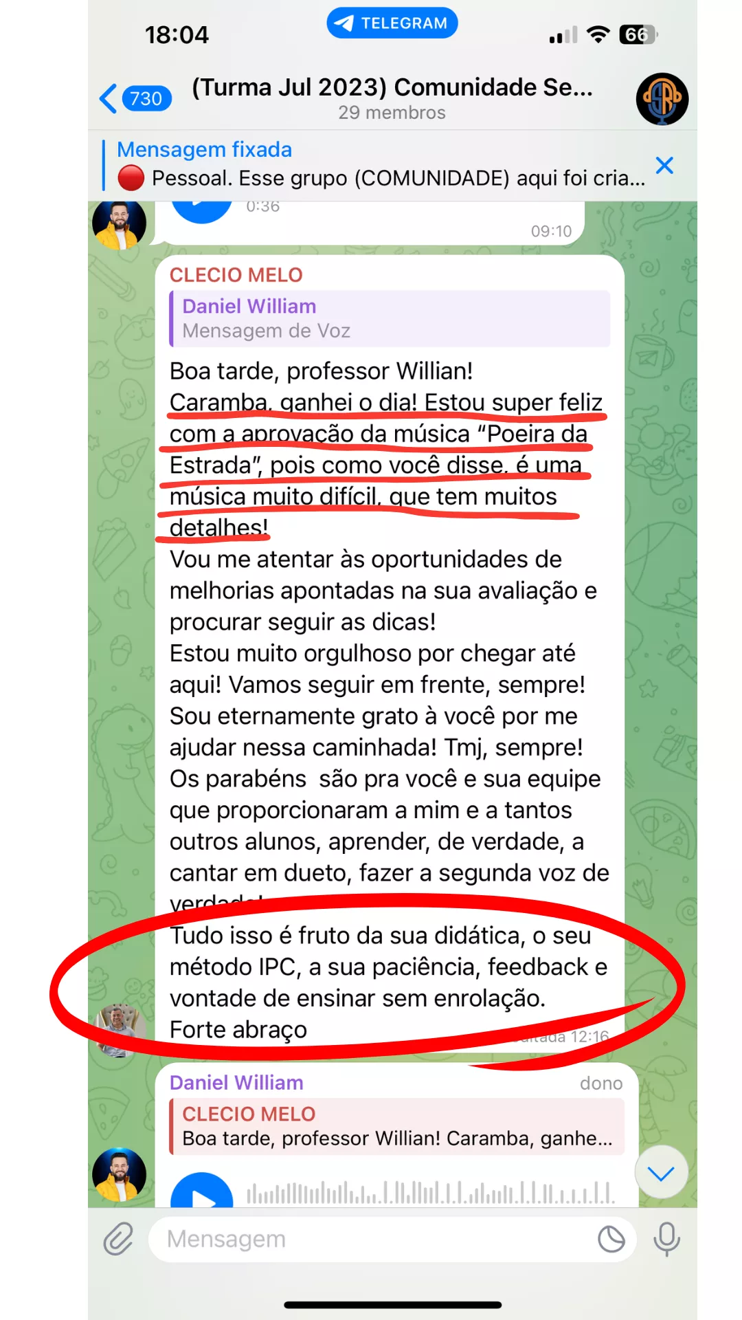 Após 40 anos cantando só primeira voz, Daniel finalmente conseguiu fazer segunda voz. Mesmo com pouco tempo para estudar, em apenas 3 dias de curso ele já estava cantando músicas em segunda voz — algo que parecia impossível antes.